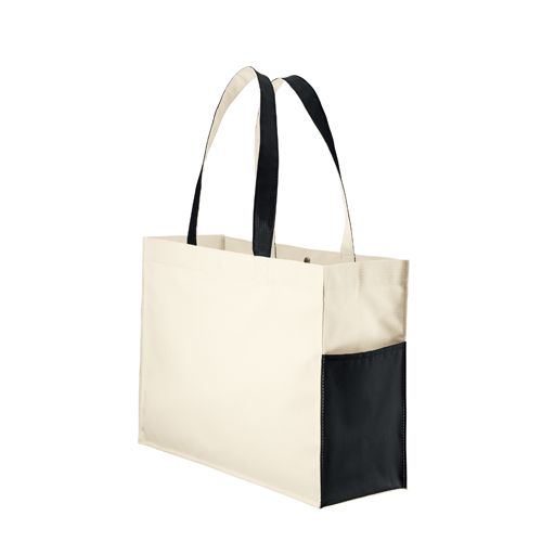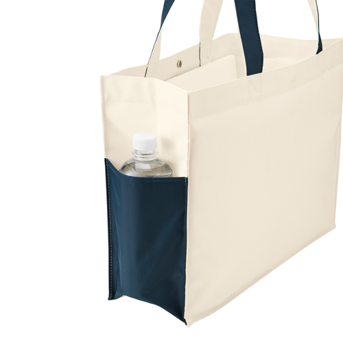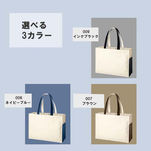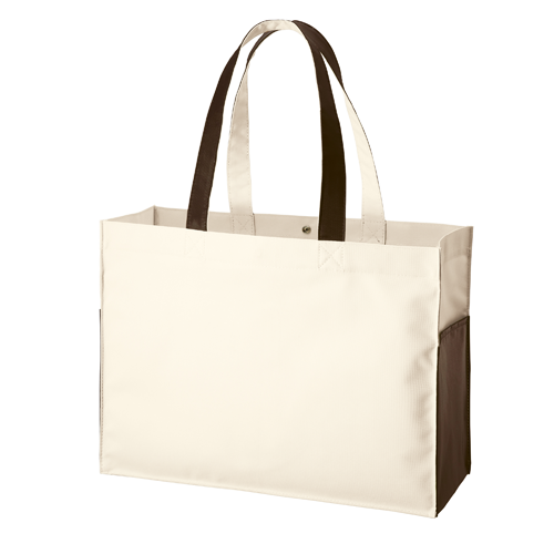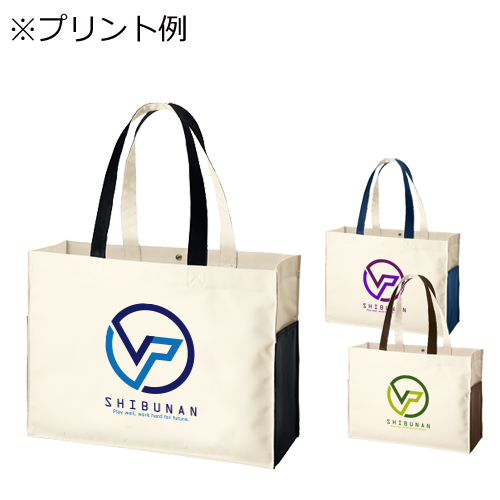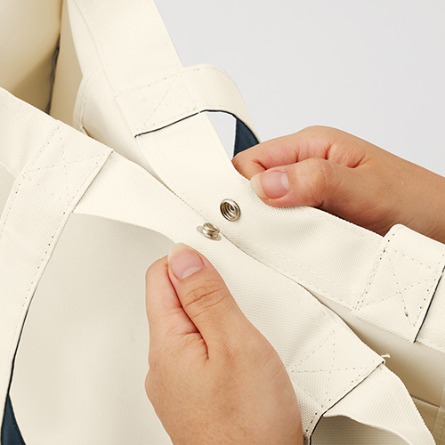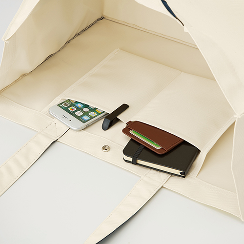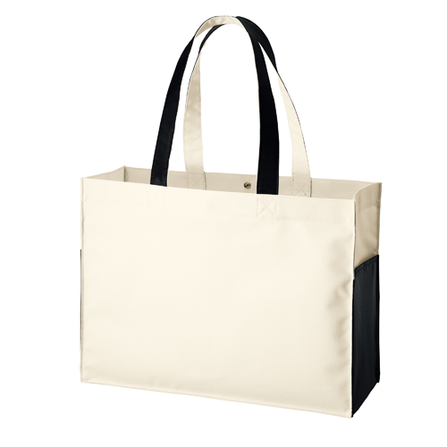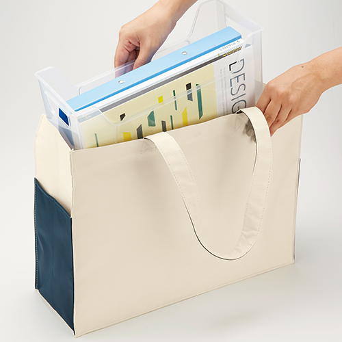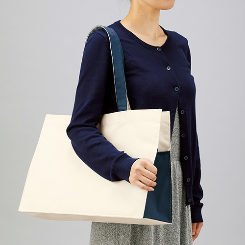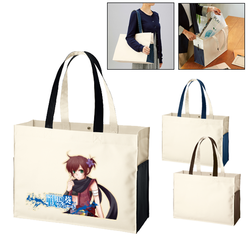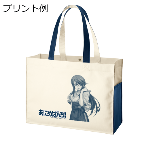 アニメ・コミックイベント等に!抜群に重宝するバッグができました。角底の大きなバッグには、なんと市販のA4サイズのファイルボックスが丸々収納可能。本や雑誌ををたくさん入れても、角がよれたり傷ついたりしにくい仕様です。口元はホック付で、中身が見えにくいのもうれしい特長。素材は既存のユーティリティバッグと同じ600×300デニールのポリエステル製で、内側にPVC加工がしてある為通常の布製バッグなどと比較して濡れにくく、汚れや突然の雨にも強い生地となっています。ポケットは内側とサイドに備え付けられており、スマホや小物の収納に役立ちます。大判トートバッグならではの大きな名入れスペースも特長です。使い勝手がいいため、販売品にもオススメのアイテムです。