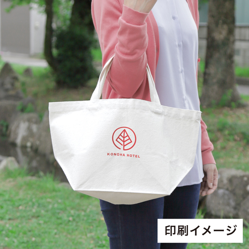 底マチがしっかりと大きい人気のランチトートエコバッグ。ランチトート=小さめという感じの商品ばかりですが、この商品は、その中でも大きめサイズのエコバッグです。容量が大きいの用途も幅広く、さまざまな業種の販促・ノベルティにオススメです。