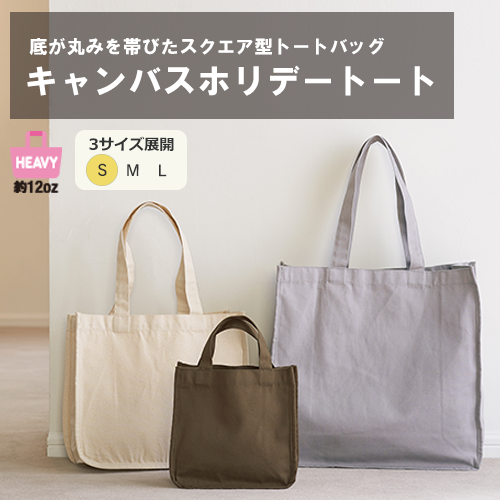 アパレルなどで人気のある、底が丸みを帯びたスクエア型のホリデートートが登場しました。しっかりとした12オンスの生地を使用しており、中の荷物が崩れにくいなど機能面にも優れております。カラーは世代問わずに人気の4色をご用意しており、ランチタイムやちょっとしたお出かけにぴったりなサイズです。印刷方法は単色からフルカラー印刷まで対応しており、ノベルティとしてはもちろん、ライブグッズやキャラクター物販など幅広くご提案頂くことが可能です。