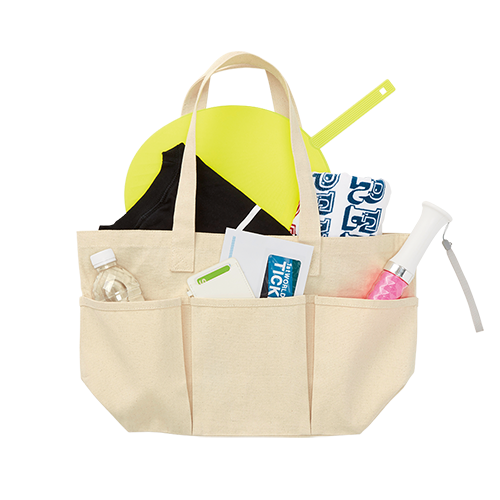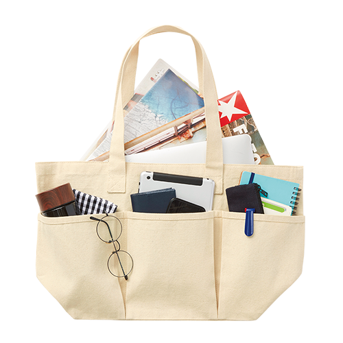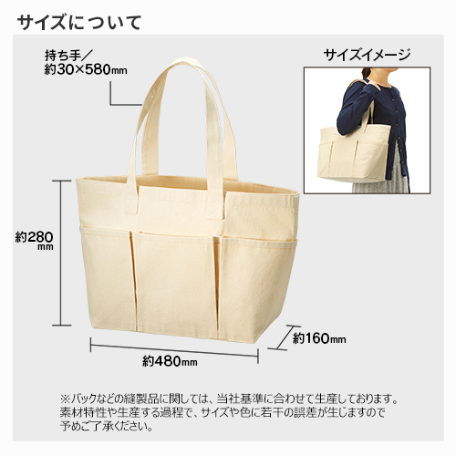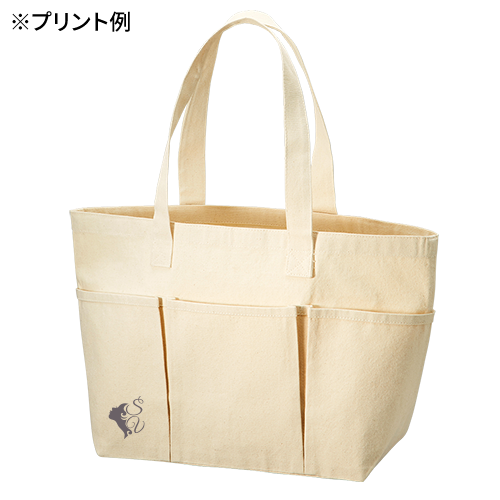 エコマーク認定のコットンを使用した大容量のトートバッグです。裏表に合計6つのポケットがついているので、小物も入れやすく使いやすいトートバッグです。お買い物バッグとしても小物がとりやすく便利に使用していただけます。印刷方法も単色からフルカラーまで対応しており、ノベルティ利用だけでなく、物販品としてもおすすめ商品です。
