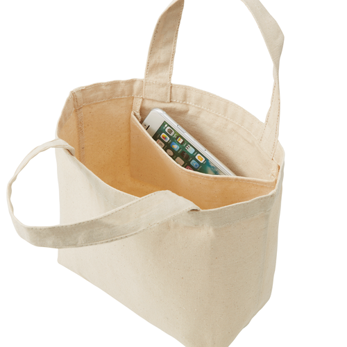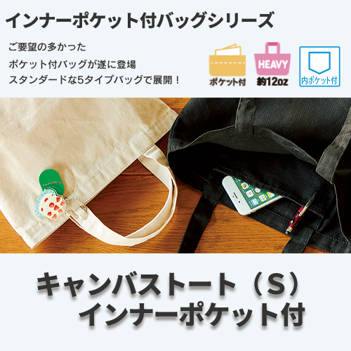厚みのあるコットン生地のトートバッグシリーズに、ご要望の多かったインナーポケット付きが登場しました。ランチタイムのお弁当などの持ち歩きや、ちょっとしたお出かけのバッグとしておすすめのサイズです。印刷方法も単色からフルカラー印刷まで対応しており、お好みのデザインでオリジナルトートバッグを作成出来ます。ノベルティはもちろん、キーホルダーフック付なので物販品としてキーホルダーとのセット販売でご提案の幅が広がります。※エコマーク付