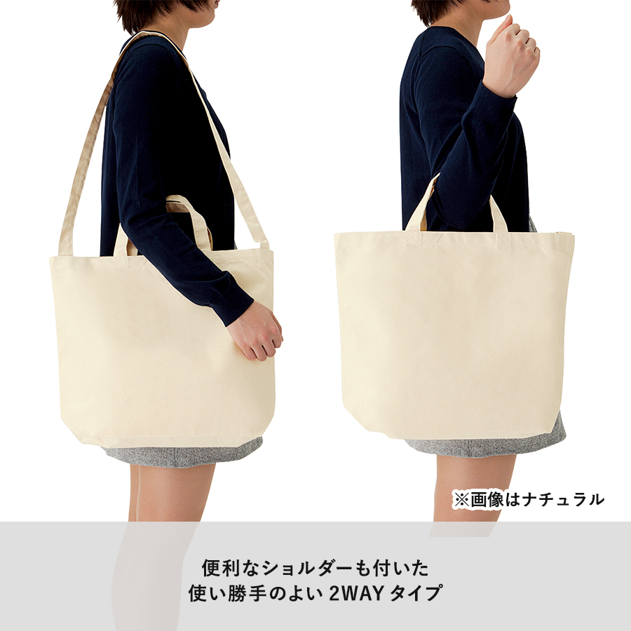 しっかりコットン生地の2WAY仕様のバッグです。容量はA3サイズ程度も余裕を持って収容可能で、ファッションスタイルに合わせて肩かけ、手持ちが選べる優れものです。