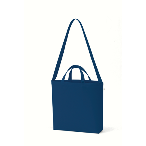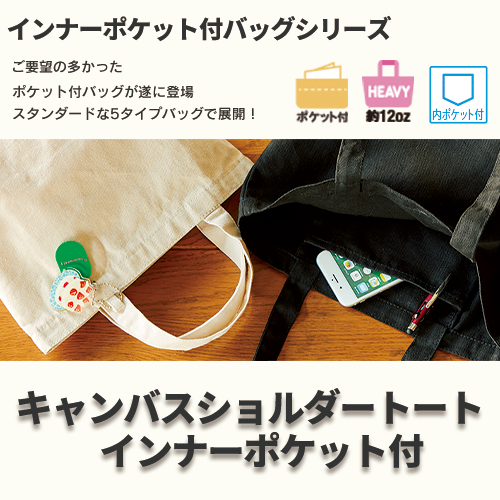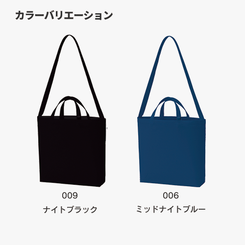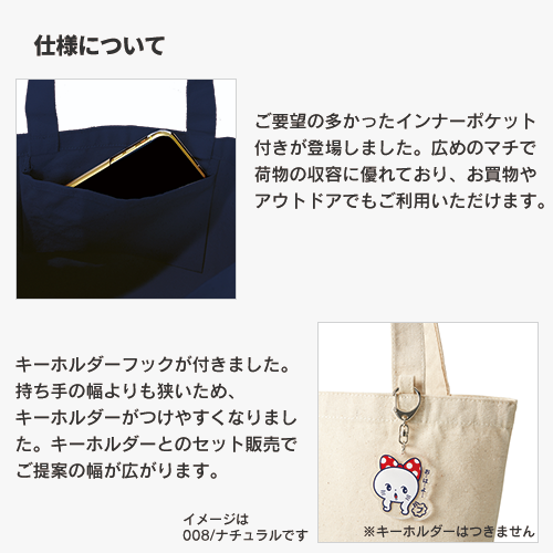 しっかりしたコットン生地の2WAY仕様のバッグです。容量はA3サイズ程度も余裕を持って収容可能で、ファッションスタイルに合わせて肩かけ、手持ちが選べる優れものです。カラーは人気のネイビー、ブラックの2色をご用意。小物やスマホをしまえるインナーポケット付きで更に使いやすくなりました。ノベルティはもちろん、キーホルダーフックも付いているので、物販品としてキーホルダーとのセット販売もおすすめの商品です。