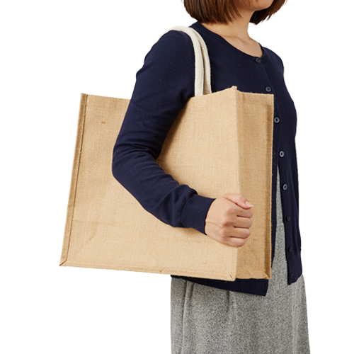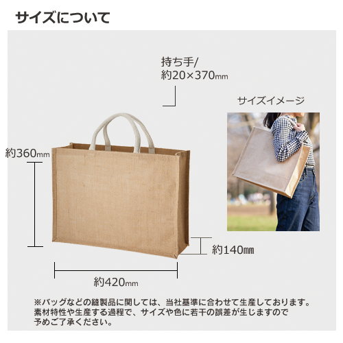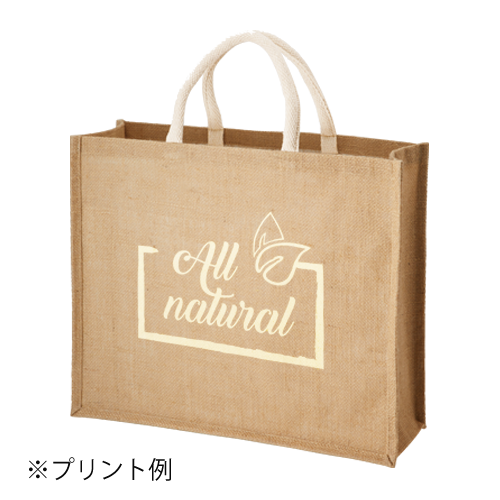 麻の一種であるジュートを使用した流行のバッグ。たっぷり入る大きめのトートなので、お買い物やアウトドアなどの荷物が多い外出時の強い味方です。地球にやさしい天然素材を使用しているので、販促品としてはもちろん、オーガニックコスメや食料品店などのパッケージとしてもおすすめです。ざっくりしたナチュラルな素材感は、バッグとしてだけでなく、インテリアとして飾ってもおしゃれです。名入れは1色からフルカラーまで対応しております。