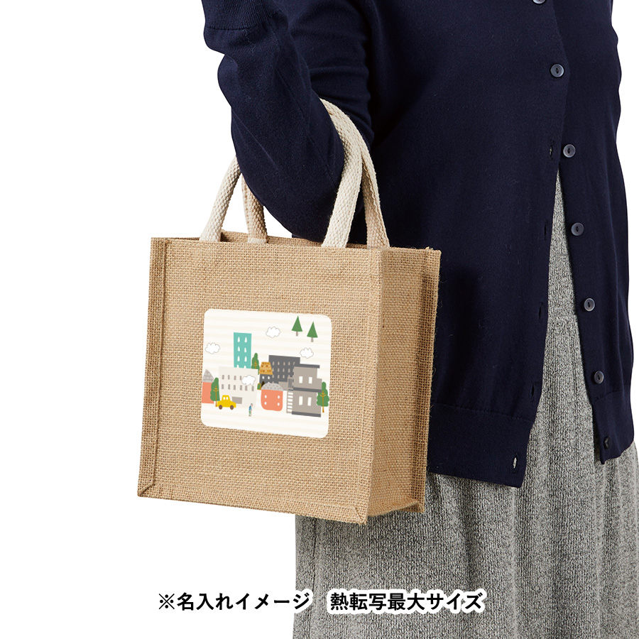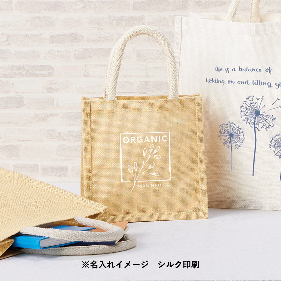 麻の一種であるジュートを使用した流行のバッグ。ランチタイムのお弁当などの持ち歩きや、ちょっとしたお出かけのバッグにぴったりなサイズです。地球にやさしい天然素材を使用しているので、販促品としてはもちろん、オーガニックコスメや食料品店などのパッケージとしてもおすすめです。ざっくりしたナチュラルな素材感は、バッグとしてだけでなく、インテリアとして飾ってもおしゃれです。名入れは1色からフルカラーまで対応しております。