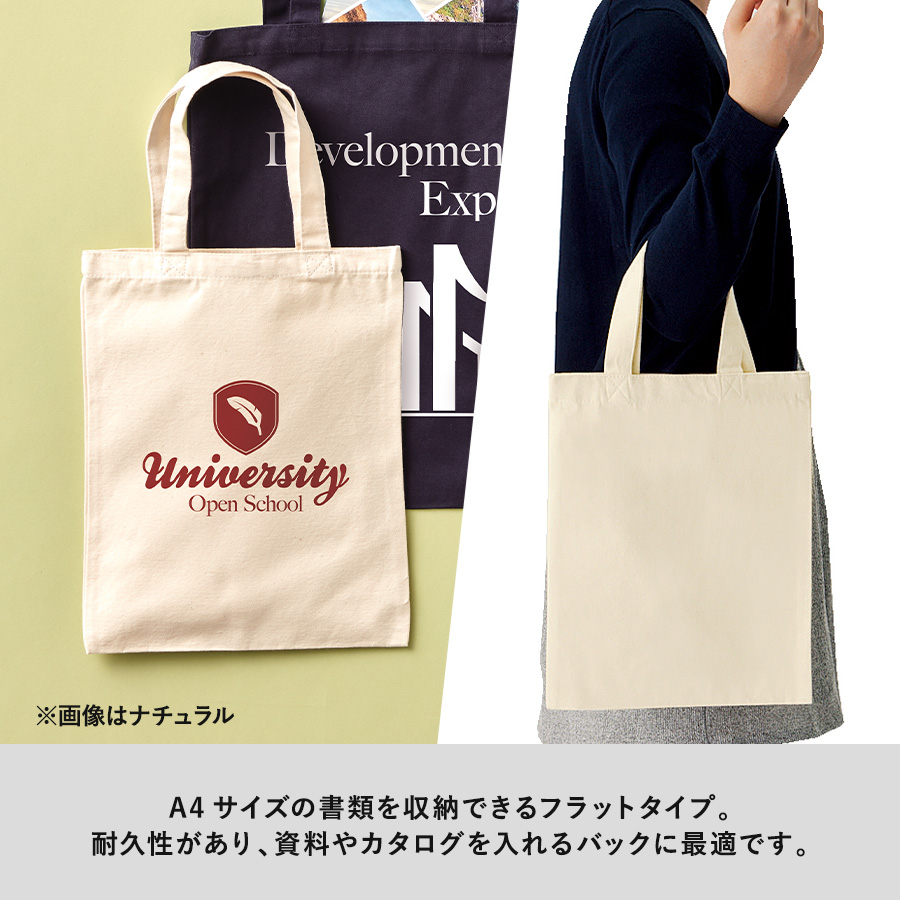 やわらかい中にも程よい厚みを持つのが、マーレススタイルのライトキャンバスバッグの特徴です。こちらはA4サイズ入るコットン生地のトートバッグです。配り物のノベルティから物販品としてもご利用いただけます。印刷方法も単色からフルカラー印刷まで対応しており、お好みのデザインでオリジナルトートバッグを作成出来ます。