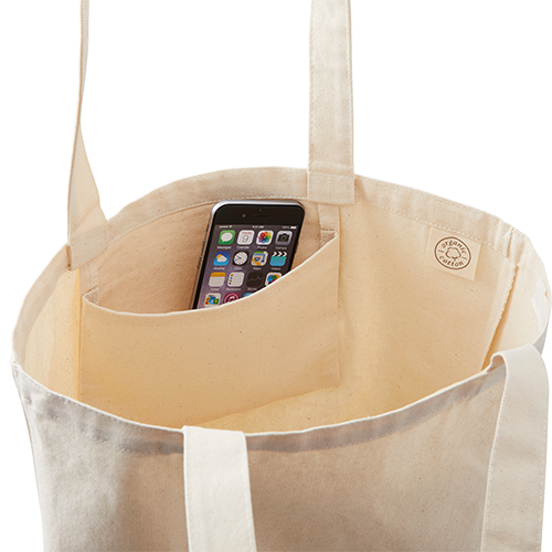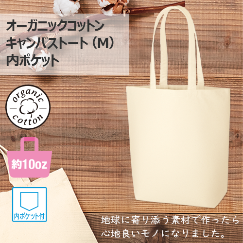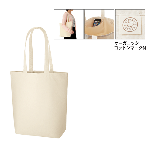 オーガニックコットンを使用したトートバッグです。A4サイズが入るマチ付のバッグは様々なシーンで活躍するアイテムです。また、使用しているオーガニックコットンは無農薬で栽培された環境にやさしい素材ですので、エコへの取り組みのアピールにも繋がります。小物が入る内ポケットが付いたバッグは、イベントグッズやアーティスト物販としてご提案頂けます。