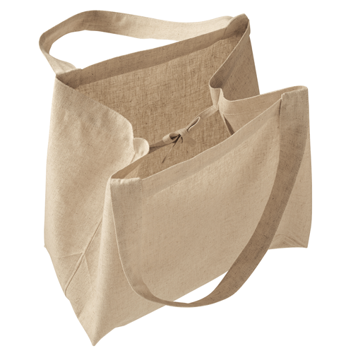 コットンとリネンを織りあわせることで、麻の素材感を残しながらしなやかな風合いに仕上げました。素朴な天然素材の風合いは、オーガニックコスメや食料品店のパッケージとしてもおすすめ。大容量のバッグなので、日ごろのお買いものバッグとして使えば荷物もたっぷり入り、デザインも周りに差が付きます。食品や化粧品関連のバッグとして、ポイント特典の景品や、販売品としてもおすすめです。1色プリントでロゴを入れるだけでも、素材に遊び心がある為インパクトのあるアイテムです。