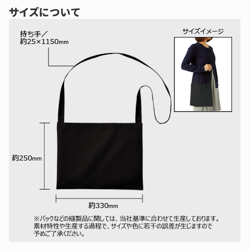 5オンスの生地を使用したサコッシュです。A4サイズが収納可能なベーシックタイプのサコッシュは、性別や年齢問わずお使い頂けるアイテムです。また、薄くて軽い5オンスの生地を使用しており、リーズナブルにオリジナルのサコッシュの制作ができます。展示会やオープンキャンパスの配布用のバッグはもちろん、ワークショップの素材としてもおすすめのアイテムです。