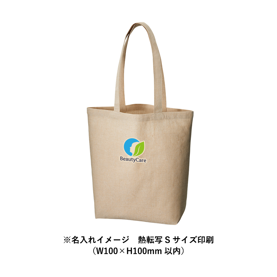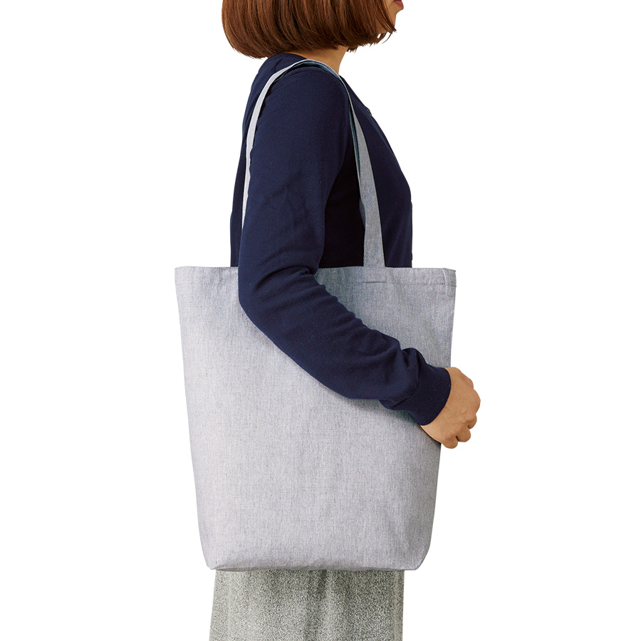 独特の霜降り調の生地は肌触りもやわらかく、名入れ映えするのに個性ある風合い。春夏らしい爽やかなブルー、グレー、ベージュのカラーバリエーションにてご用意しております。スタンダードな船底型の底マチは厚みのある荷物もスッキリ納める人気の形状です。※生地の特性上、表面に小さな糸の塊(ネップ)が生じます。予めご了承ください。